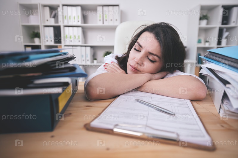 Усталая молодая руководитель офиса или бухгалтер дремлет на своем столе