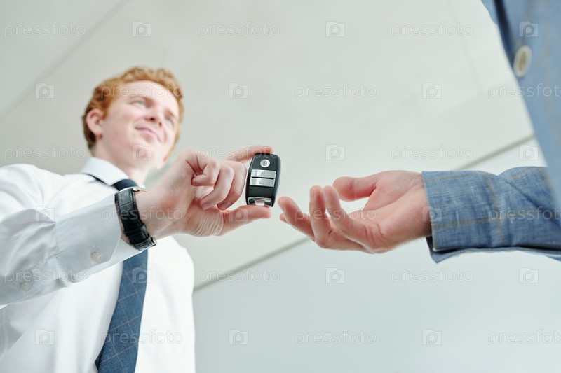 Рука мужского покупателя собирается взять дистанционное управление системой сигнализации нового автомобиля