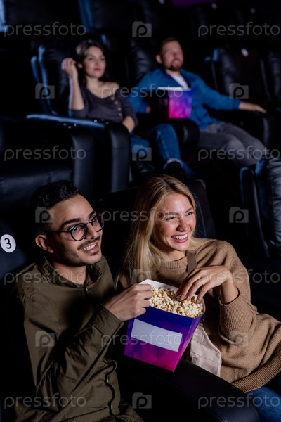 Молодые свидания с коробкой попкорна сидят в темном кинотеатре и смотрят на экран