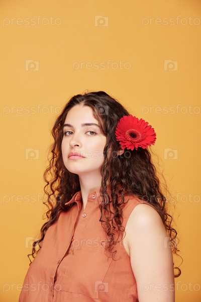 Красивая молодая женщина с красной герберой в ее красивых длинных темно-волнистых волосах