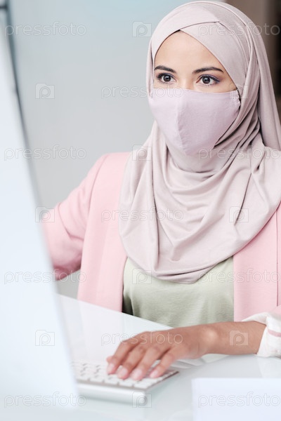 Молодая современная бизнесвумен в хиджабе и защитной маске анализирует данные