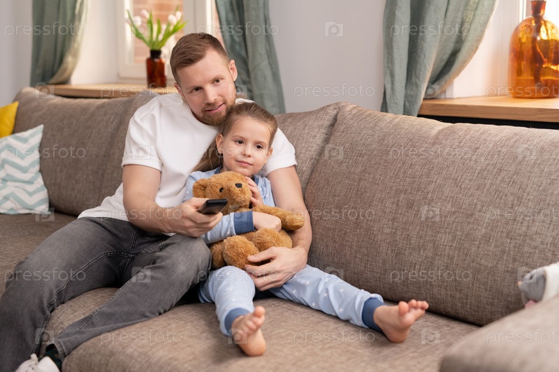 Молодой ласковый мужчина с пультом дистанционного управления обнимает свою маленькую дочь