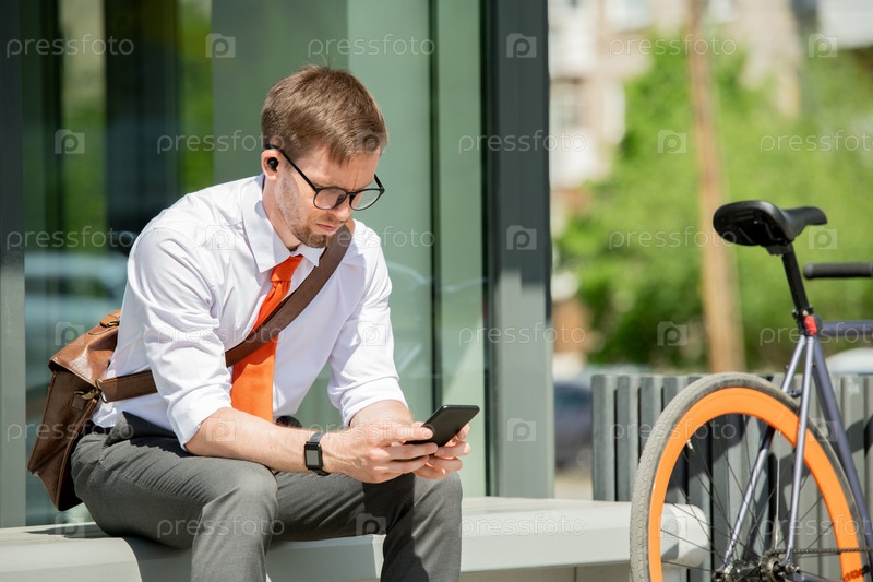 Молодой агент сидит на скамейке у современного здания со своим велосипедом рядом