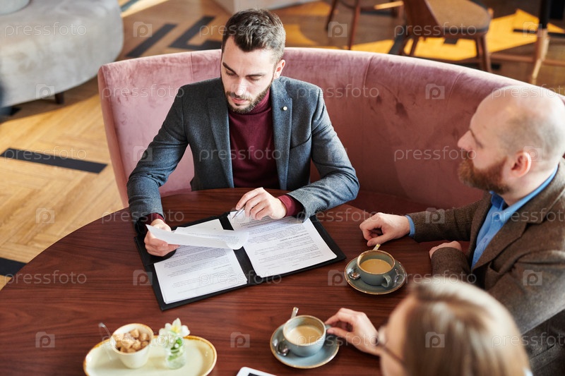 Бизнесмен читает контракт с новой финансовой компанией
