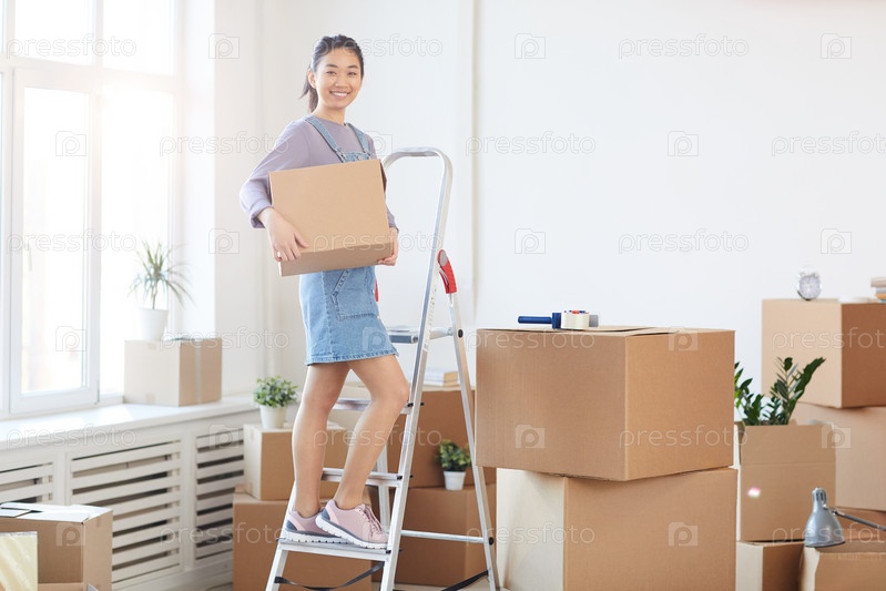 Улыбающаяся азиатская женщина распаковывает коробки в новом доме
