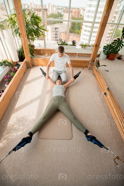 Молодой тренер по воздушной йоге обучает девочку с руками и ногами, прикрепленными к веревкам