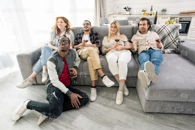 Группа молодых друзей отдыхают на диване в гостиной, выпивая красное вино