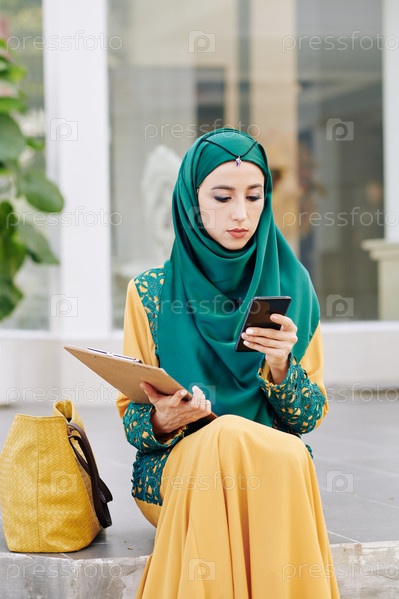 Мусульманская бизнесвуменка проверяет телефон