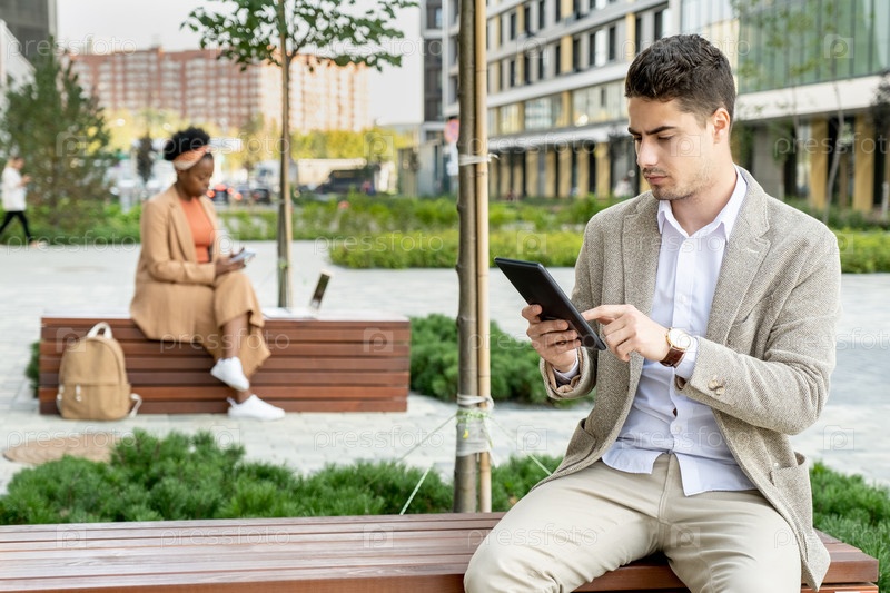 Молодой серьезный бизнесмен в формальной одежде, указывающий на экран цифрового планшета