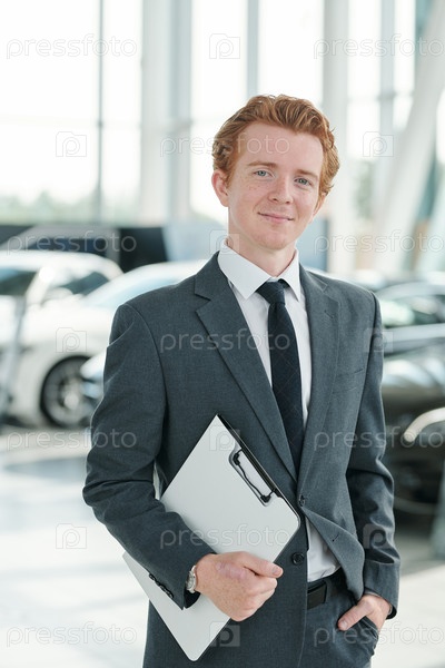 Молодой успешный дилер в элегантном костюме и галстуке, держащий доску с документами