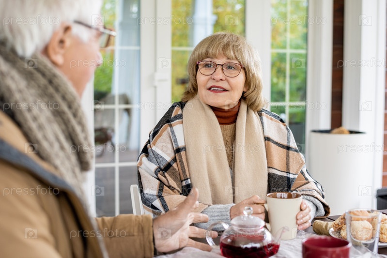 Счастливая зрелая женщина в очках и теплом casualwear смотрит на своего мужа