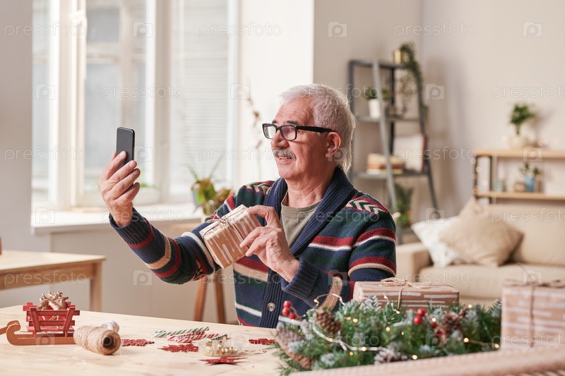 Улыбающийся пожилой мужчина с белыми волосами в кардигане показывает рождественский подарок другу во время видеоконференцсвязи на смартфоне