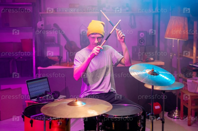 Современный молодой серьезный музыкант в повседневной одежде, поднимающий руки с барабанами