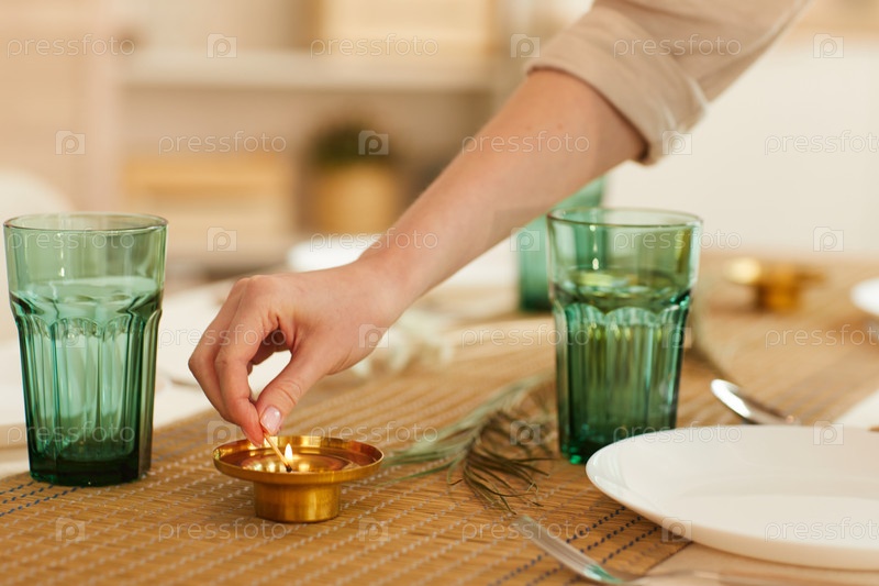 Женщина зажигает свечу на обеденном столе