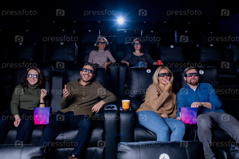 Большая группа счастливых молодых друзей в 3D-очках проводит досуг в кино