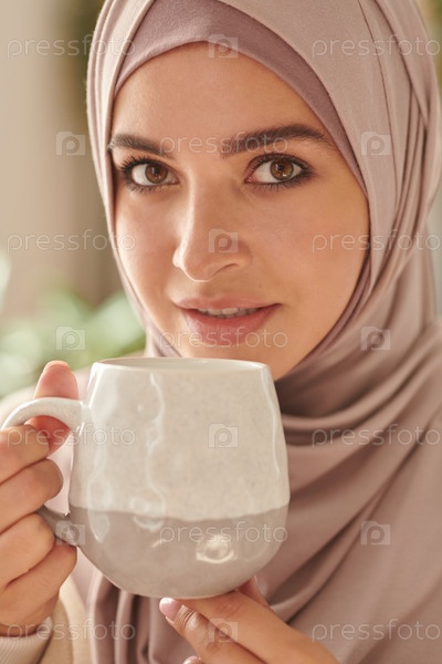 Вертикальный крупный портрет молодой взрослой привлекательной ближневосточной женщины, одетой в стильный пастельно-розовый хиджаб и пьющей чай, смотрящей на камеру