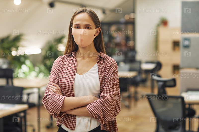 Молодая женщина, носящая маску в офисе