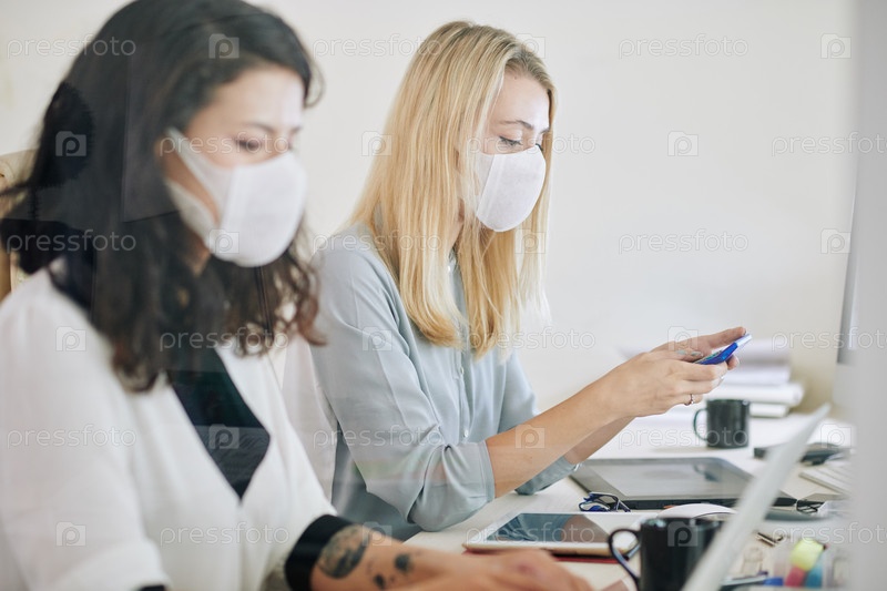 Деловая женщина в медицинской маске проверяет телефон