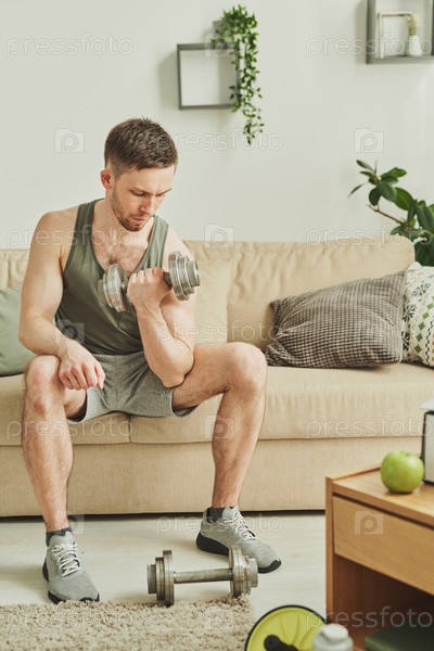 Молодой спортсмен с гантельками тренируется на диване перед ноутбуком дома