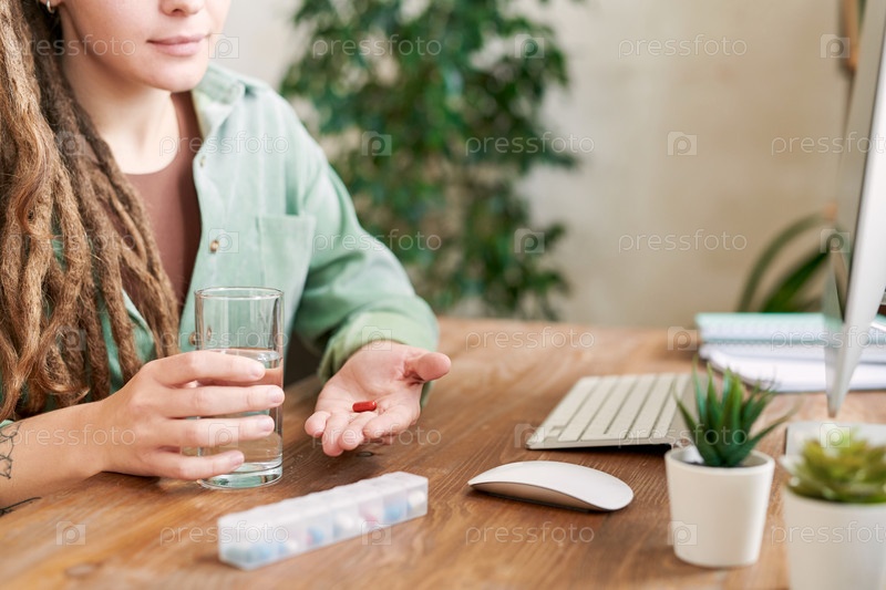 Ближайшее изображение содержимого молодая женщина с дрейдоками, сидящая за столом и держащая стакан воды во время приема витаминов на рабочем месте, концепция биохакинга