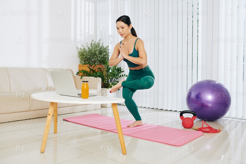 Женщина делает одноногий приседание