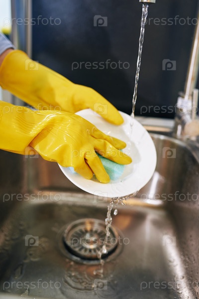 Домашняя хозяйка моет посуду
