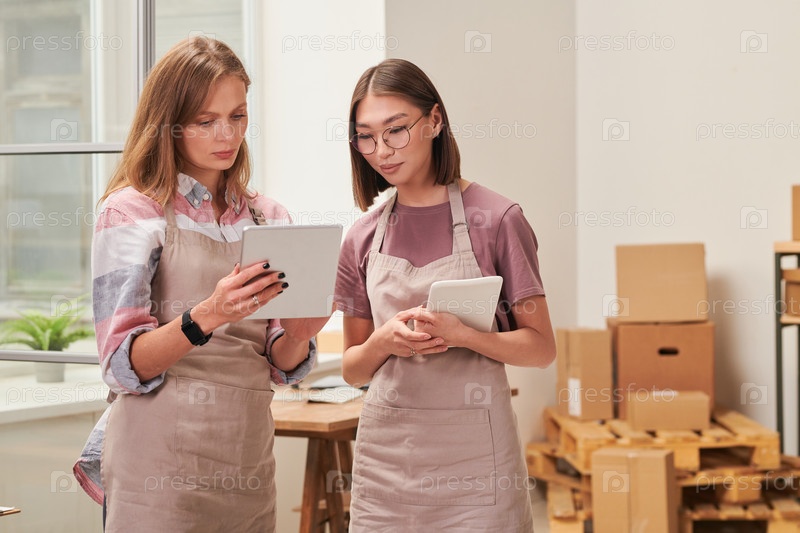 Загруженные многонациональные дамы в фартуках осматривают складские предметы с помощью приложения для планшетов, работая вместе
