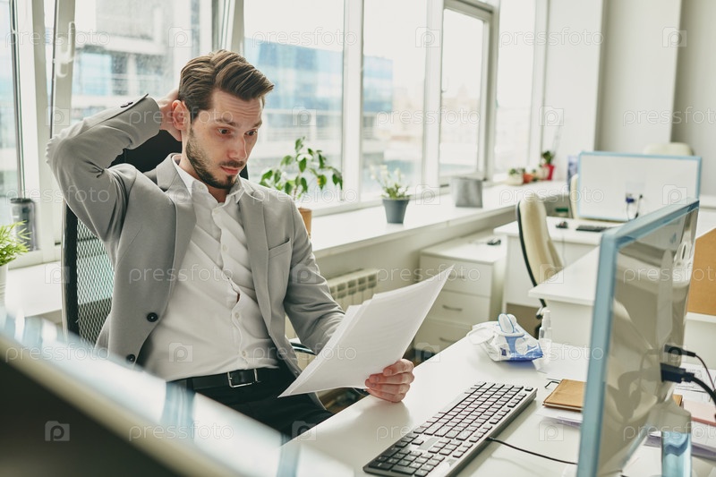 Молодой озадаченный бизнесмен держал руку за спиной головы, глядя на бумаги