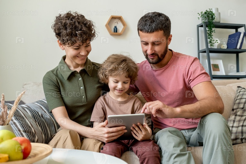 Милый мальчик с сенсорной панелью и его молодые любящие родители смотрят фильм