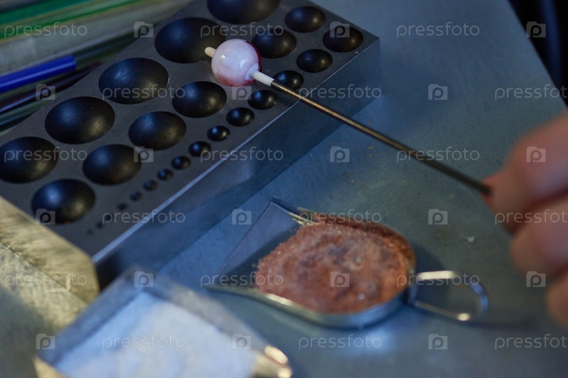 Мастер лампообработки, держащий палку с расплавленным стеклянной заготовкой в формователе