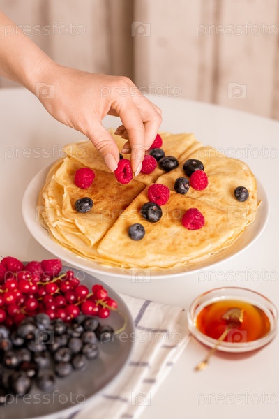 Рука молодой женщины или домохозяйки, берущей свежую малину сверху блина