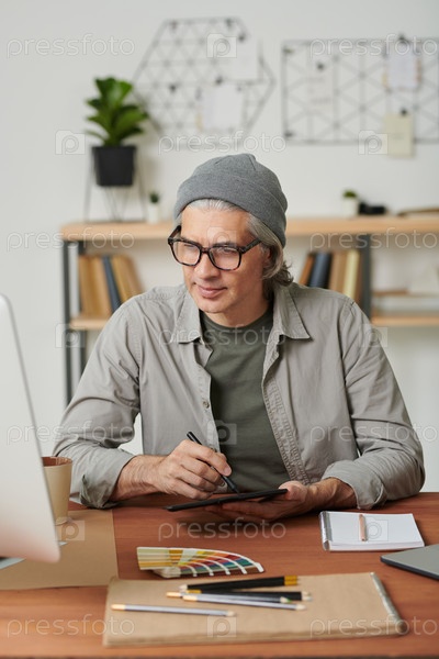 Контент-красивый зрелый дизайнер, сидящий за деревянным столом с цветовой палитрой и использующий графический планшет во время оформления