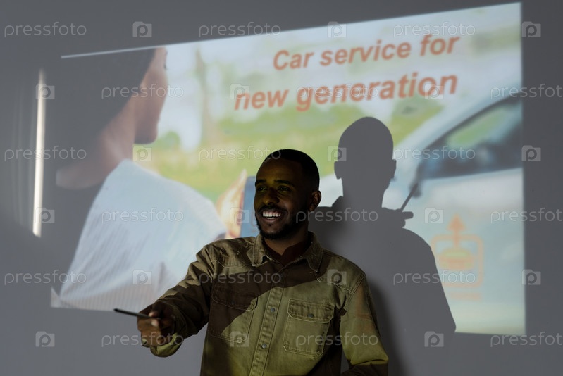 Молодой успешный бизнесмен или маркетолог, стоящий перед большим экраном