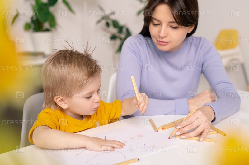 Помогает сыну нарисовать картинку