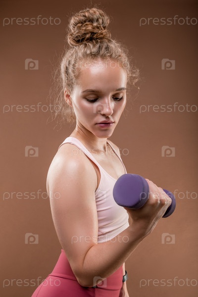 Молодая серьезная сильная женщина в спортивной одежде, занимающаяся гантелями в изоляции