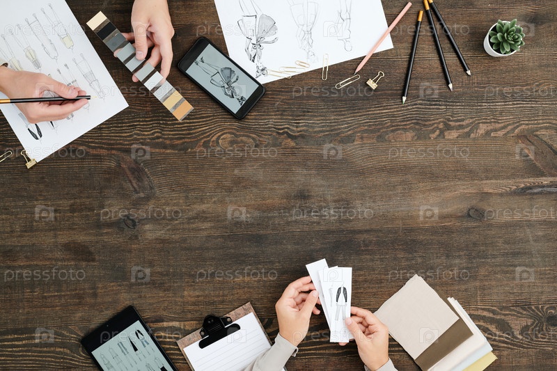 Обзор рук креативных дизайнеров с цветными образцами и эскизами