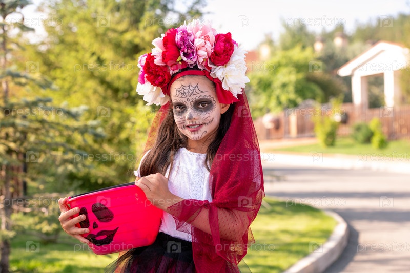 Улыбающаяся девочка в костюме ведьмы Хэллоуина держит ведро со сладостями