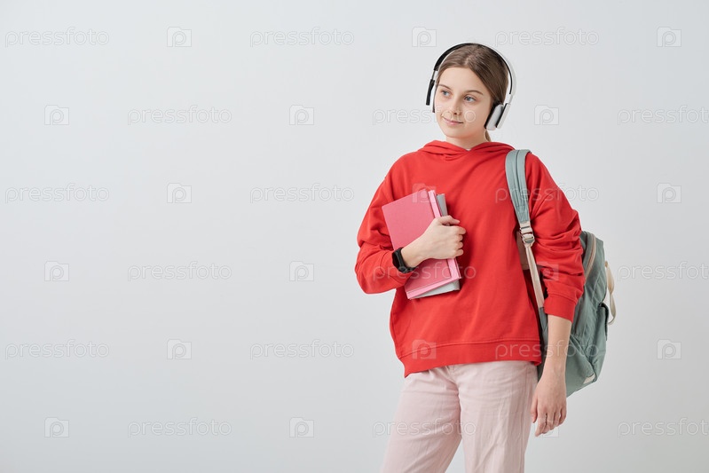 Девушка-подросток в красной толстовке с капюшоном и белых джинсах держит книги за грудь