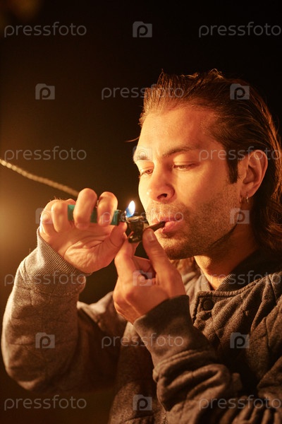 Молодой случайный мужчина с табачной трубой во рту, держащий зажигалку на широкой части