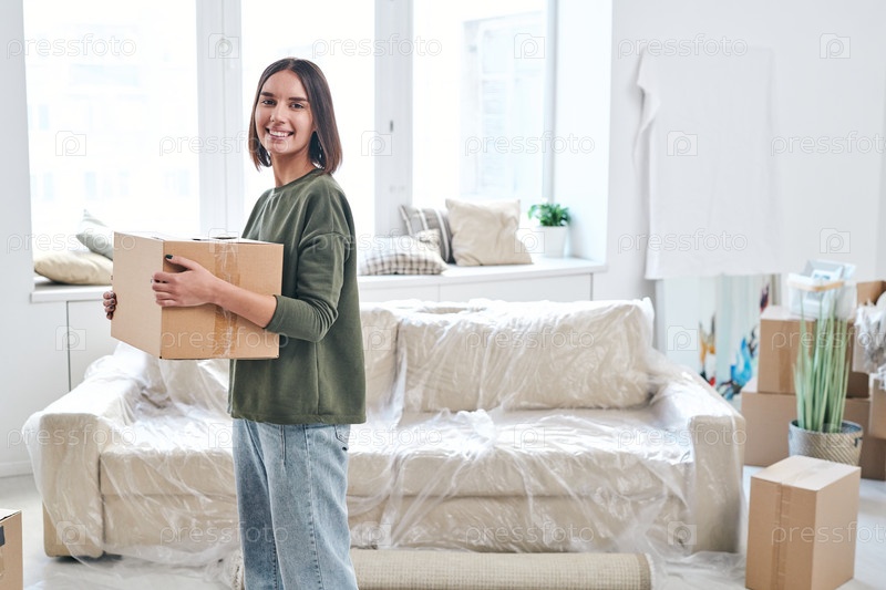 Счастливая молодая женщина с упакованной коробкой смотрит на тебя со зубчатой улыбкой