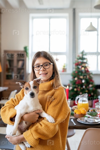 Веселая собака-подросток с милым псом на руках стоит в гостиной