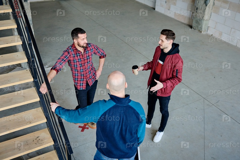 Трое молодых творческих бизнесменов стоят на полу незавершенного здания