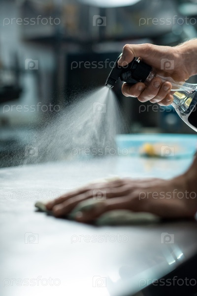 Руки современного работника кухни ресторана, распыляющего дезинфицирующее средство на стол