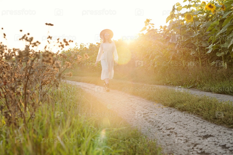 Красивая девушка в шляпе, солнцезащитных очках и платье движется по тропинке между подсолнечниками