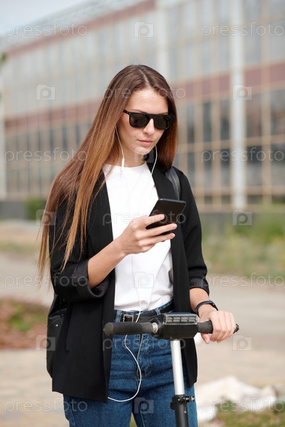 Молодая женщина в наушниках и повседневной одежде прокручивает список плейлистов на смартфоне