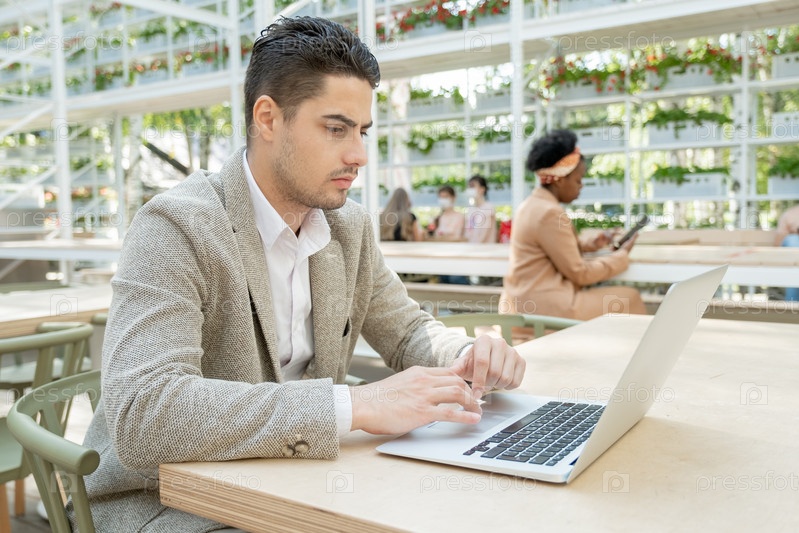 Молодой бизнесмен смотрит на дисплей ноутбука во время онлайн-конференции