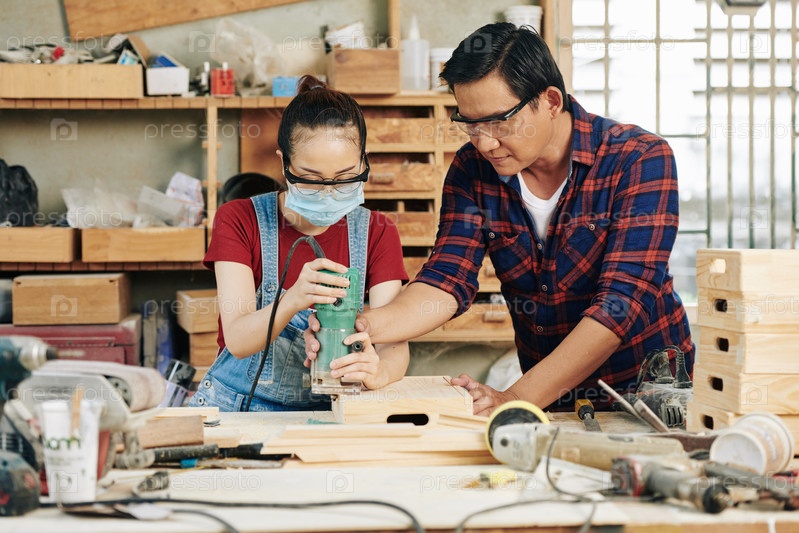 Опытный плотник помогает ученику