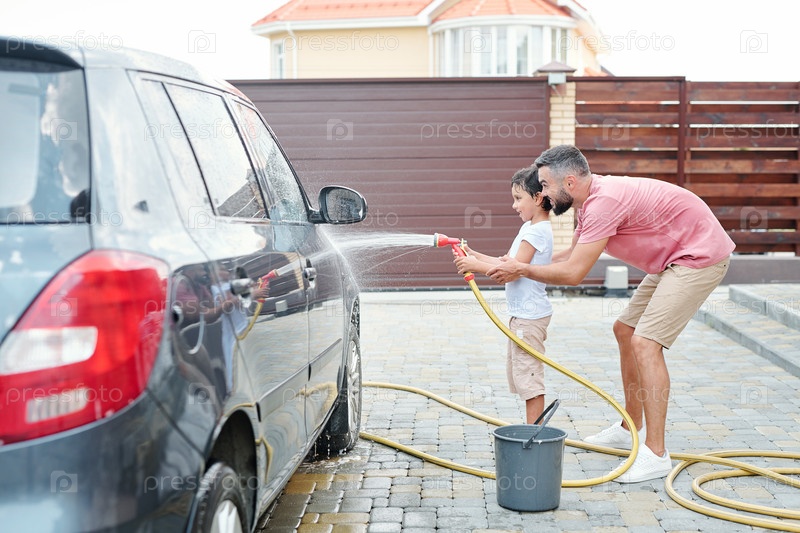 Мужчина и мальчик моют машину