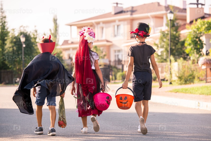 Задний вид трех детей Хэллоуина в костюмах, несущих корзины с лакомствами