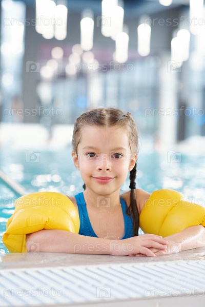 Улыбающаяся девочка в купальниках смотрит на тебя после урока плавания в бассейне